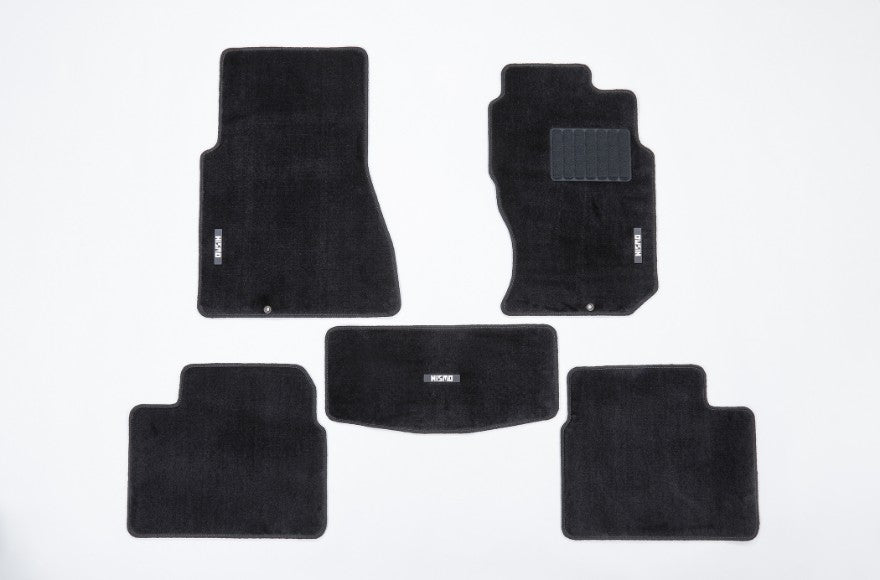 This floor mat is sporty and luxurious, with a plain-cut fabric of bold black thread and an aluminum first-generation NISMO logo plate.